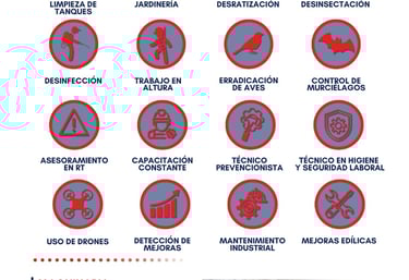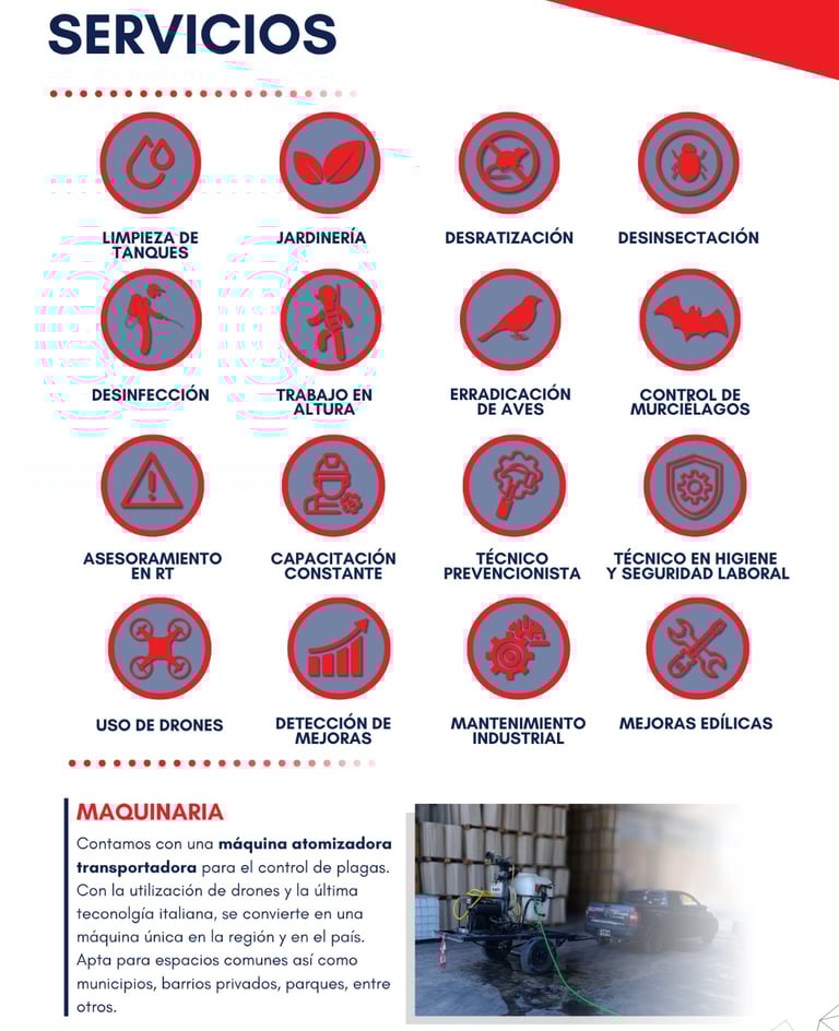 Trabajos en Jardinería. Limpieza de tanques, trabajos en altura y mantenimiento industrial con tecnología avanzada. Asesoramiento en RT. Uso de drones. Mejoras edilicias. Capacitación constante. Técnicos en Seguridad e Higiene Laboral. Muchas más.
